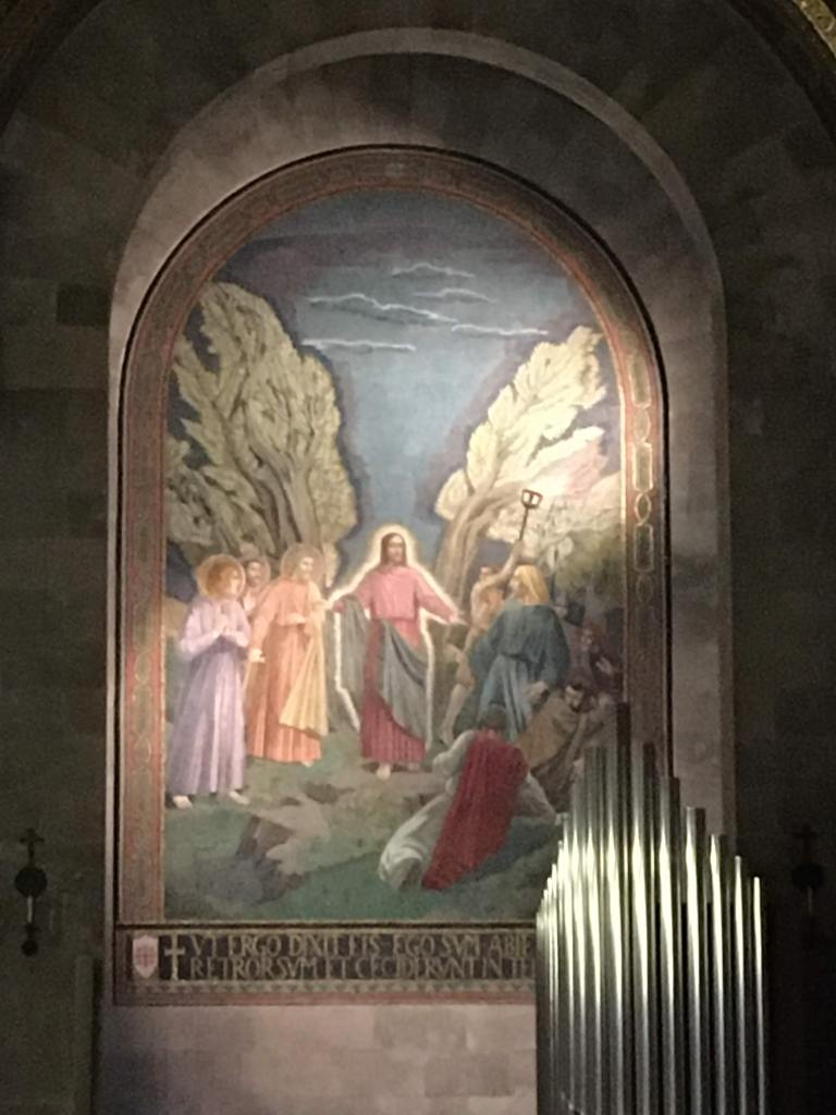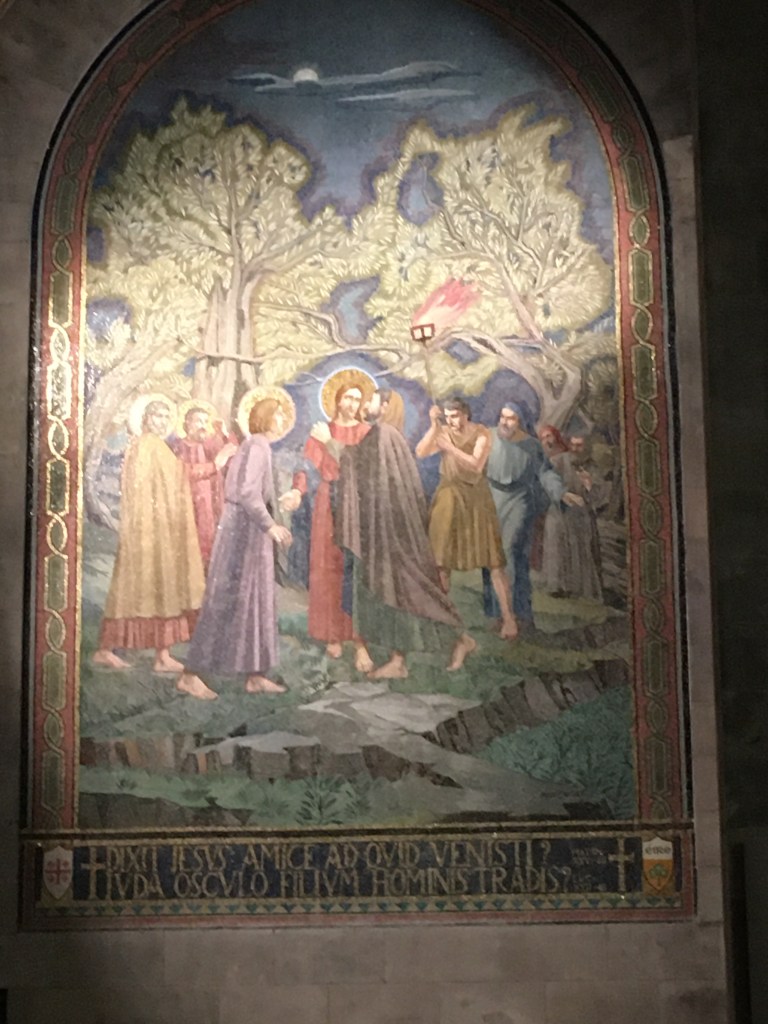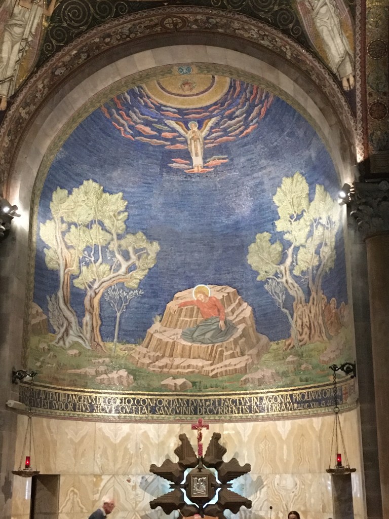 Church of Gethsemane (Called the Church of Agony). 12 nations assisted in the building of the church which is why there are 12 domes. The four statues are the four evangelists. The picture is of the beginning and the end, the Alpha and the Omega.