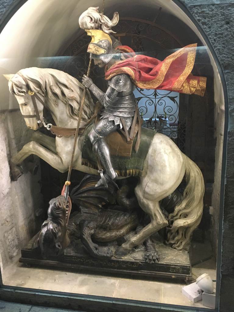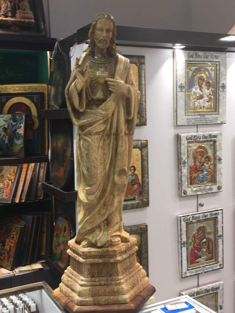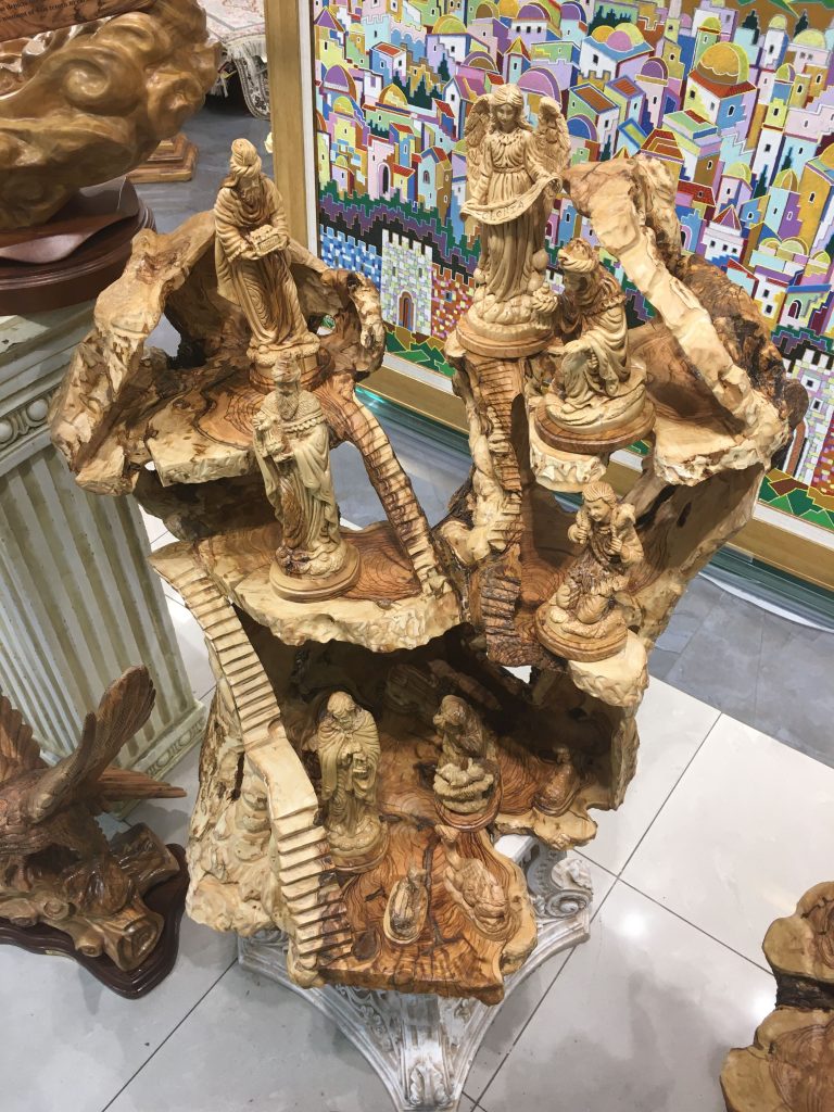 Elaborate olive wood carvings at christian shop in Bethlehem