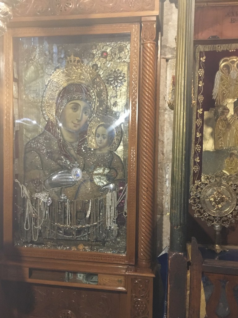 This is the only icon found in the Catholic Church where Mary is found smiling. It is called Mary of Bethlehem. Other images of her are called “Mary of Jerusalem” where she is sad or serious after Jesus’ death.